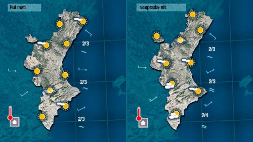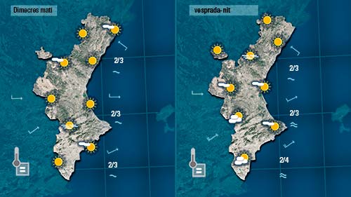 No res canviarà demà dimecres . El cel podrà estar enteranyinat de núvols alts. El vent bufarà fluix de l’oest i del sud-oest i les temperatures es mnatindran suaus, altes per l’època.