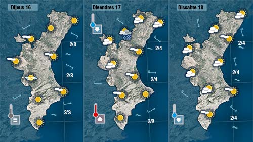 Divendres el vent girarà a mestral al nord, on el cel quedarà més ennuvolat i les temperatures començaran a baixar, però al centre i al sud bufarà de ponent deixant les temperatures al voltant o per damunt dels 20 graus a la costa.