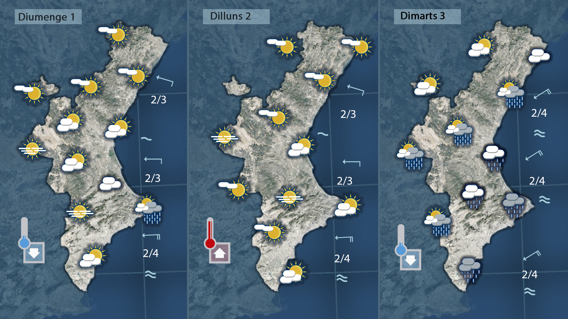 No espere pluges d’entitat fins dimarts però pense que diumenge es vora poc el sol i plourà dèbiulmente a la costa i que dilluns tot i vore’s un poc més el sol i pujar lleugerament les temperatures durant bona part de la jornada de cara a la nit els núvols guanyaran terrenys i les pluges consistència