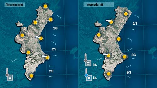 Demà dimecres els pocs canvis que podem comentar faran menció a les temperatures que baixaran lleugerament junt a la costa mantenint-se sense canvis al centre i per l’interior.