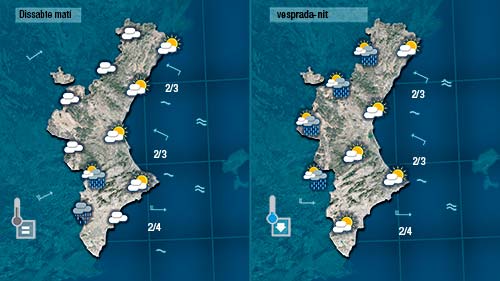 Demà dissabte en espera un dia més variable. Notarem els primers efectes de la borrasca que enra des de l’Atlàntic i que partir de diumenge ens tindrà ben ocupats i distrets. Durant el matí podrà ploure a la mitad sud de la Comunitat, s’obriran clars de vesprada per tronar a cobrir-se el cel i donar pluges dèbils per l’interior a poqueta nit.