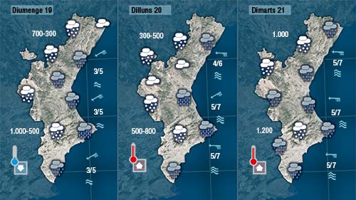 Diumenge la pluja sembla que serà prou general (encara que en estes situacions de gregal sempre plou més al sud de València i al nord d’Alacant), i la cota de neu anirà baixant de forma progressiva durant la vesprada-nit de diumenge i durant la matinada de dilluns.