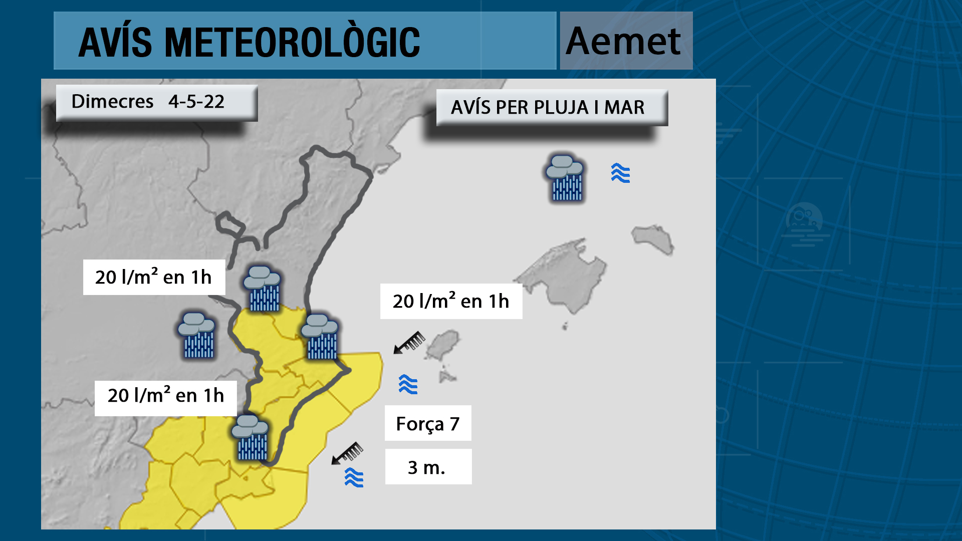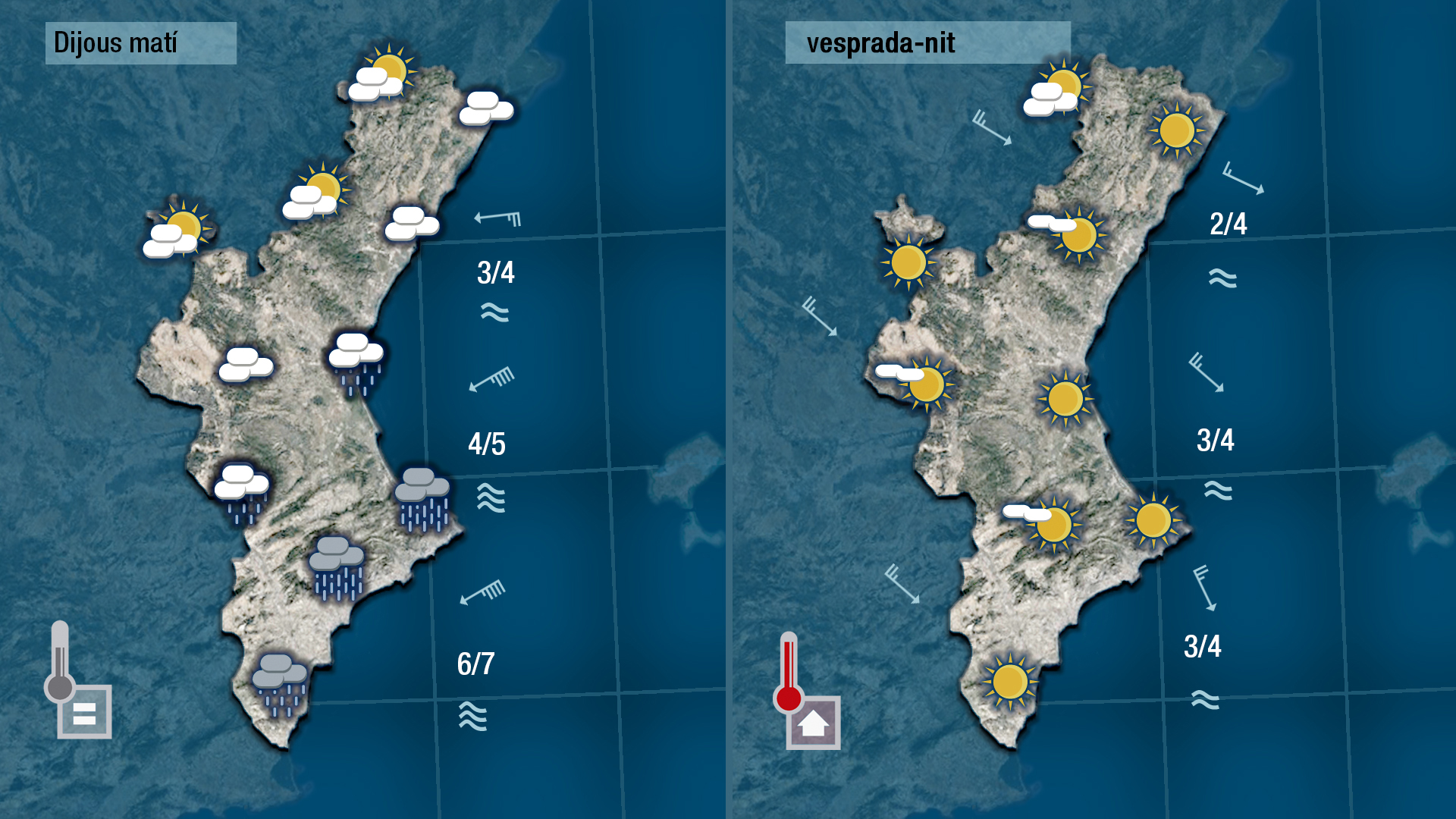 El sol es deixarà vore poc o no res però al nord de València i a Castelló les pluges que es registren seran de caràcter dèbil. Al centre i al sud Aemet manté l’avís meteorològic per pluges fortes i li afegeix el de mala mar al litoral sud de València i al d’Alacant on el gregal podrà bufar amb ratxes fortes (fins a força 7) i deixar ones de més de tres metres