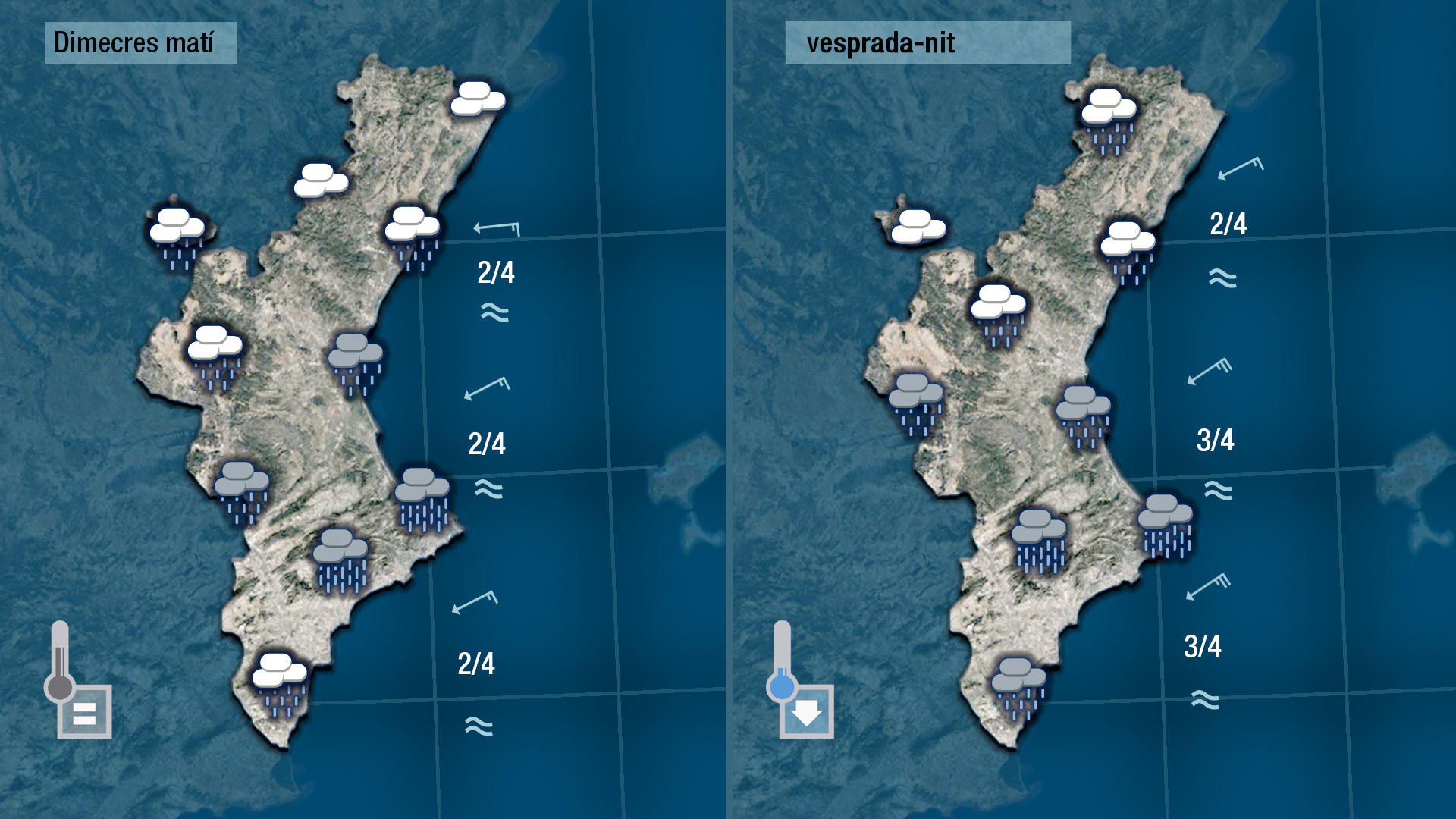 Hi haurà zones de la Mitad nord de la Comunitat valenciana on les pluges només siguen anecdòtiques però al rogle de sempre, al sud de València i al nord d’Alacant, pot ploure amb intensitat moderada o forta durant bona part del dia. Les temperatures es mnatindran ben fresques i amb pocs canvis entre mínimes i màximes.