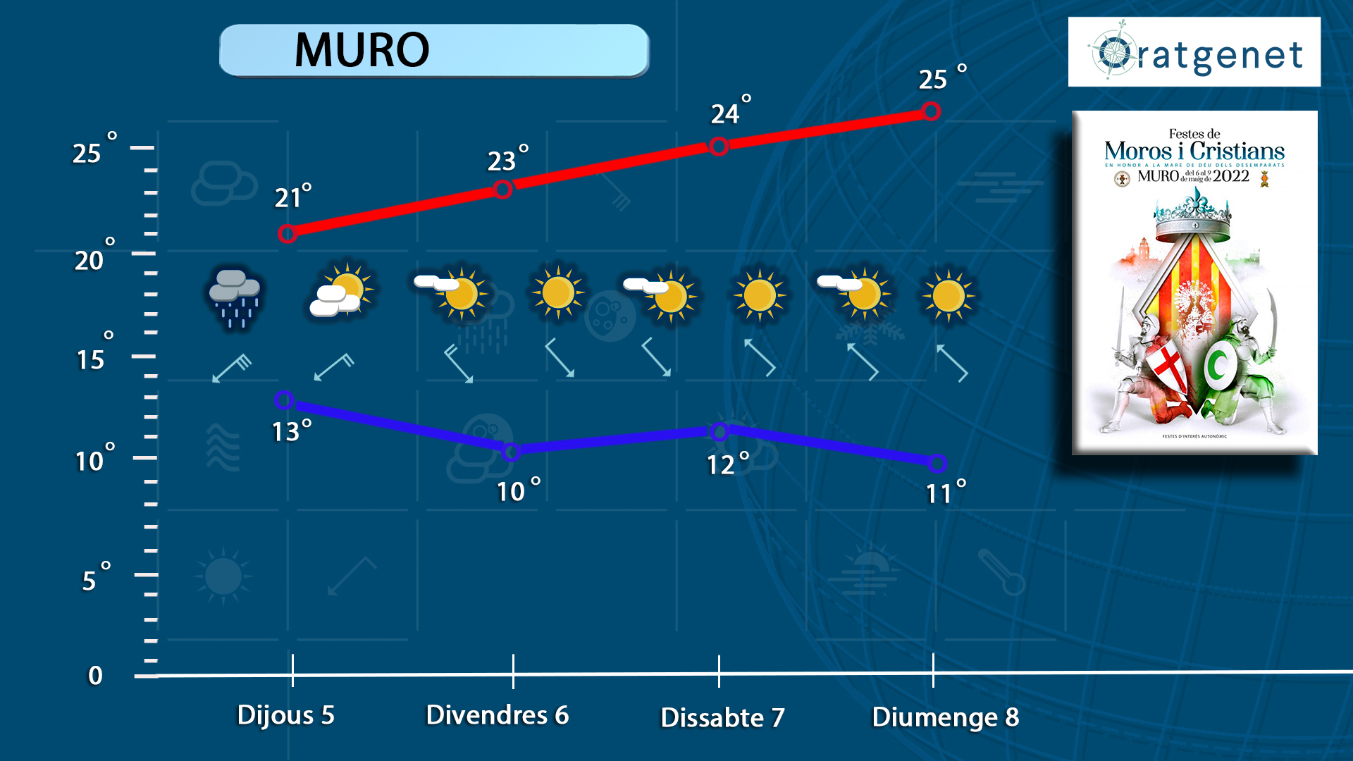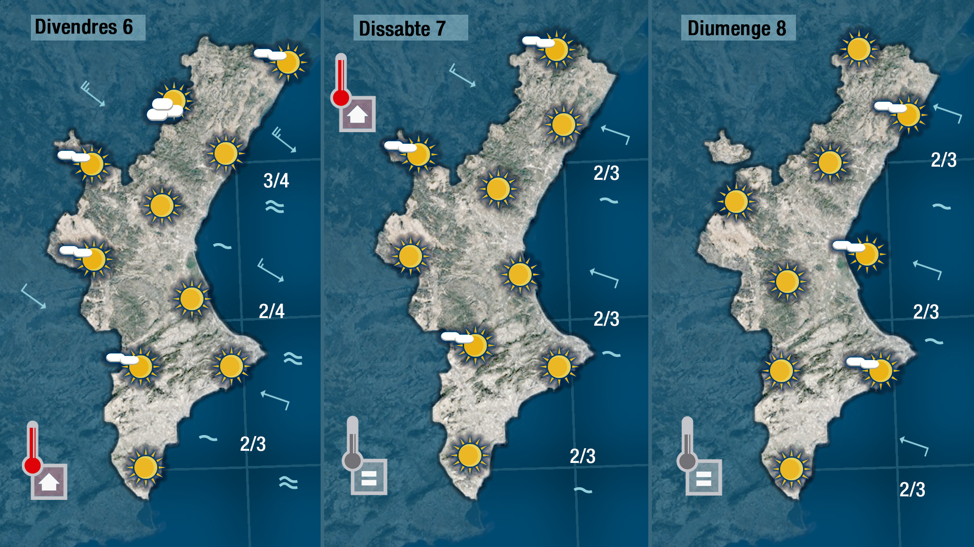 El mapa per als tres dies següents fa goig de dibuixar, de vore i de comentar perquè el sol ens acompanyarà tant divendres com el cap de setmana regalant-nos temperatures primaverals. Un ambient perfecte per disfrutar a l’aire lliure del mar o la muntanya, o d’anar a Muro a disfrutar les seues festes de moros i cristians