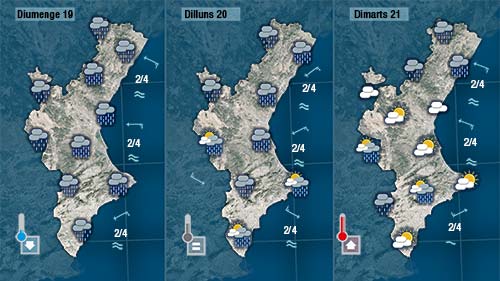 Dilluns també serà un dia plujós, sobretot al nord on el vent bufarà de gregal. Al sud el mestral farà que siga més difícil que es registren pluges importants però no desartem algun ruixat, i com veieu al mapa dimarts encara serà un dia variable i insegur.