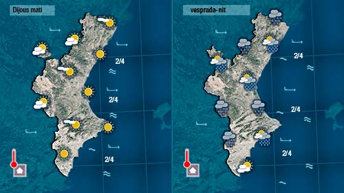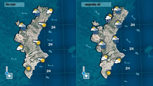 Hui també estarem atents a la neu que com ahir de vesprada podrà fer acte de presència entre els 1.300 i els 1.400 metres al nord de la Comunitat. Per unes hores o dies tornarem a l’hivern. De matí farà més sol que de vesprada quan el cel quedarà més cobert i les pluges es faran més gererals al nord. La segona part del dia també notarem com es reforça el vent.
