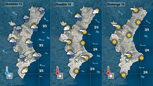 Divendres tornarem a tindre un oratge molt variable i de nou més fred. Els núvols i els clars alternaran al cel des de primera hora del dia amb ruixats que de matí semblen més problables al nord i de vesprada al sud.