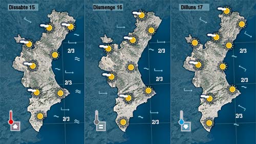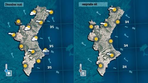 Demà divendres el vent serà el principal protagoniste del matí. Bufarà especialment fort a la mitad nord i caldrà esperar a la vesprada perquè vaja perdent força. A primera hora quedaran núvols a la mitad nord de la Comunitat i al litoral del sud de València i del nord d’Alacant encara pldria regostrar-se algun ruixat fins a mig matí. De vesprada acabarà imposant-se el sol.
