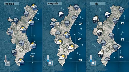 Podran obrir-se calrs de vesprada al centre i al sud, però a poqueta nit en traslladar-se la borrasca cap a les Balears el vent tindrà més recorregut marítim sobre el litoral de la Comunitat Valenciana on podran registrar-se precipitacions de més entitat.