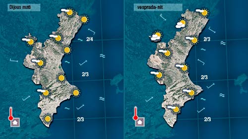 Demà dijous encara pujaran ln poc més les temperatures. Un parell de graus tant mínimes com màximes. Vorem més núvols al nord i per l’interior i pinzellades de núvols alts a la costa.