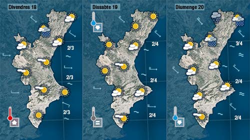 Entre divendres i dissabte ens creuarà una franja de núvols de norda sud però només de forma puntual, anecdòtica podrien deixar alguna gota. Les temperatures pujaran divendres amb l’ajuda del ponent i baixaran lleugerament dissabte.