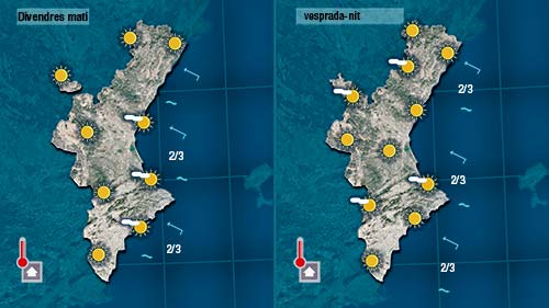 Serà demà divendres quan més apretarà la calor. Tindrem un dia molt pesat, difícil de passar perquè per la nit mujaran les temperatures i al centre del dia molts termòmetres tornarana enfilar-se fins als 40 graus.