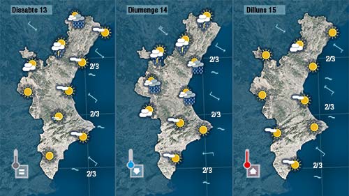 A mig matí de diumenge pot ploure a bona part de la mitad nord de la Comunitat. Tronarà al nord i per l’interior i posteriorment els núvols i la pluja avançaran cap a l’est. En bufar de mestral les temperatures baixaran. Un descens que serà més acusat a Castelló i al nord de València.