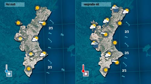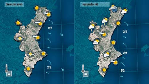 Demà dimecres també haurem d’esperar al migdia per vore créixer nuvolades a les muntanyes del nord. El matí serà assolellat i el migdia calorós, amb màximes que quedaran prop dels 30 graus a la major part d’observatoris. Només al nord i per l’interir qeudaran al voltant dels 25.