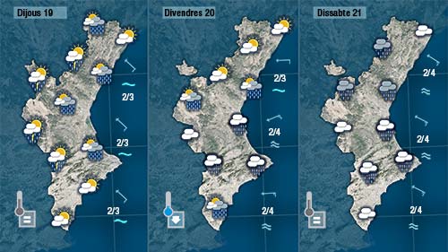 Dijous les tronades seran més generals i podran avançar més cap a l’est tocant el centre i localment punts de la costa. Es disiparan durant la matinada de dijous a divendres, i encara que divendres podrem vore el sol la major part de dia a última hora de la vesprada o a poqueta nit els núvols deixaran el cel cobert registran-se les primeres pluges de cara a la nit.