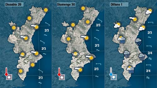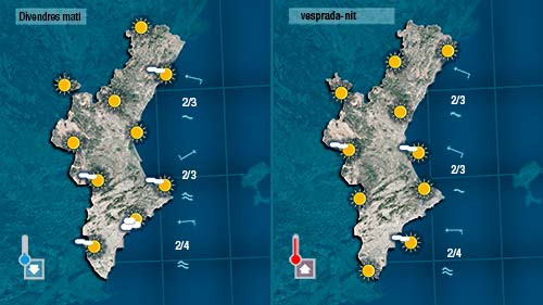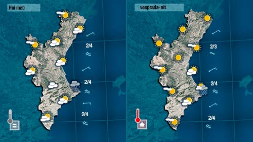 Serà al nord on desapareguen els núvols en primer lloc mentre que al sud encara podrà caure algun plugim, sempre més probable en punts pròxims a la costa. Esta vesprada tret d’algun ruixat ‘despistat’ acabarà imposant-se el sol per tot arreu.