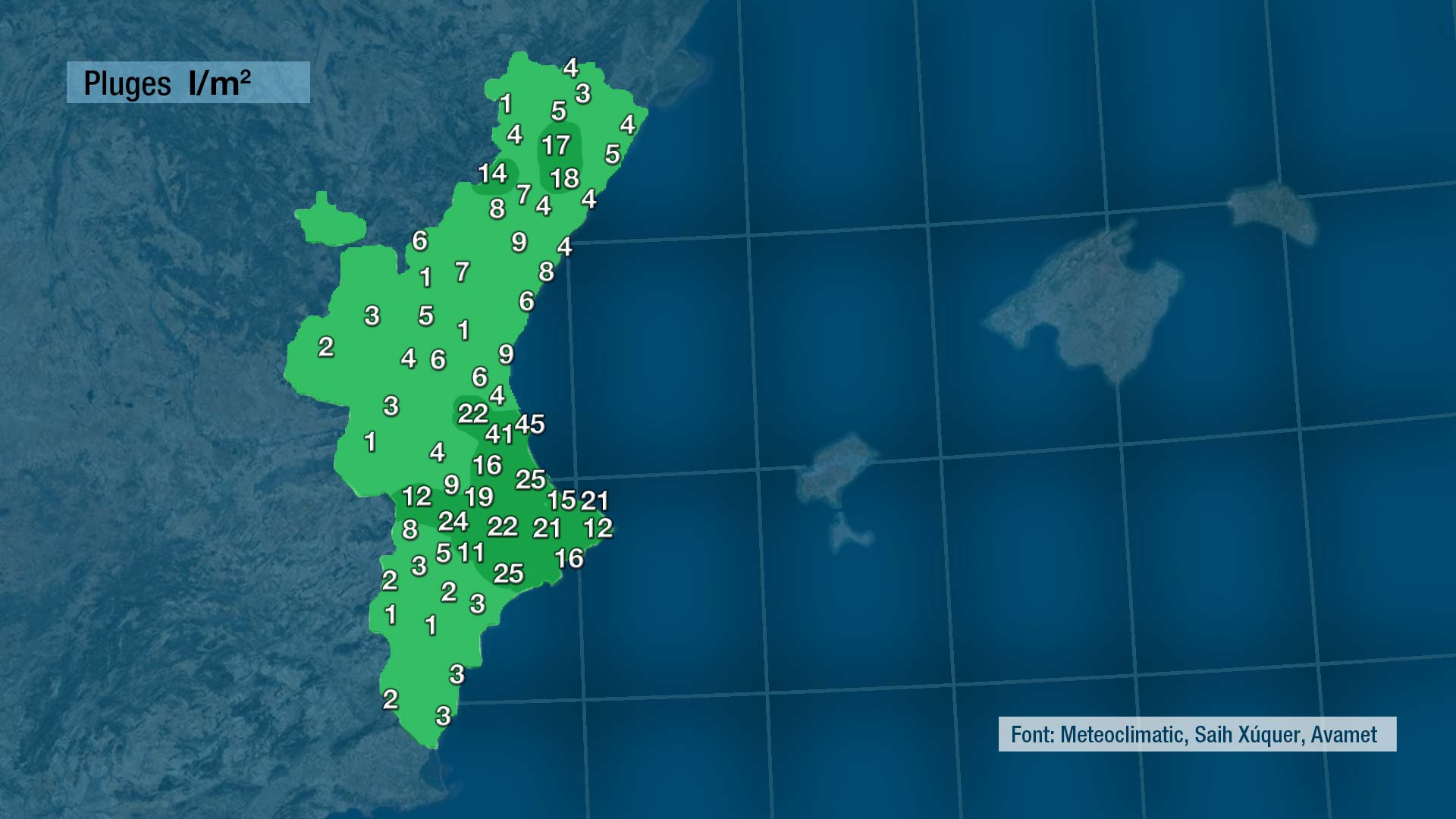 El resum de les precipitacions de les últimes 24 hores queda com podeu vore al mapa. No han sigut tan generals com ens haguera agradat però no ha quedat molt lluny del que s’esperava.