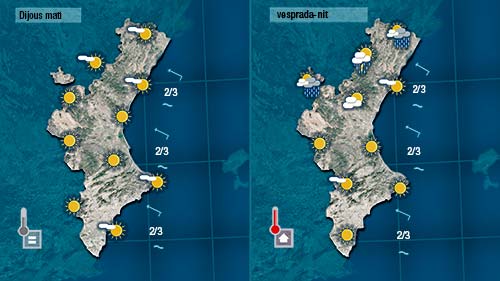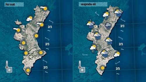 Durant la nit i matinada s’han desfet elsnúvols i les tronades, i tot i haver començat el dia amb el cel ras o amb pocs núvols, caldrà estar atents esta vesprada a les tronades que es formaran en punts de muntanya i a la seua evolució perquè hi ha models que tornen a donar ruixat d’intensitat moderada a forta al nord i per l’interior, i un posterior desplaçament cap a l’est.