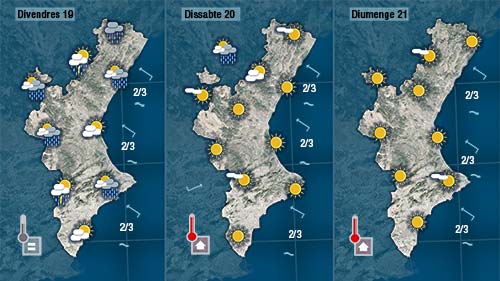Divendres direm adéu a la primavera amb oratge molt variable i insegur. Un dia en que amb molta probabilitat acabarà plovent a la major part de la Comunitat. Les precipitacions durant el matí seran dèbils i més probables en punts de la costa del sud.