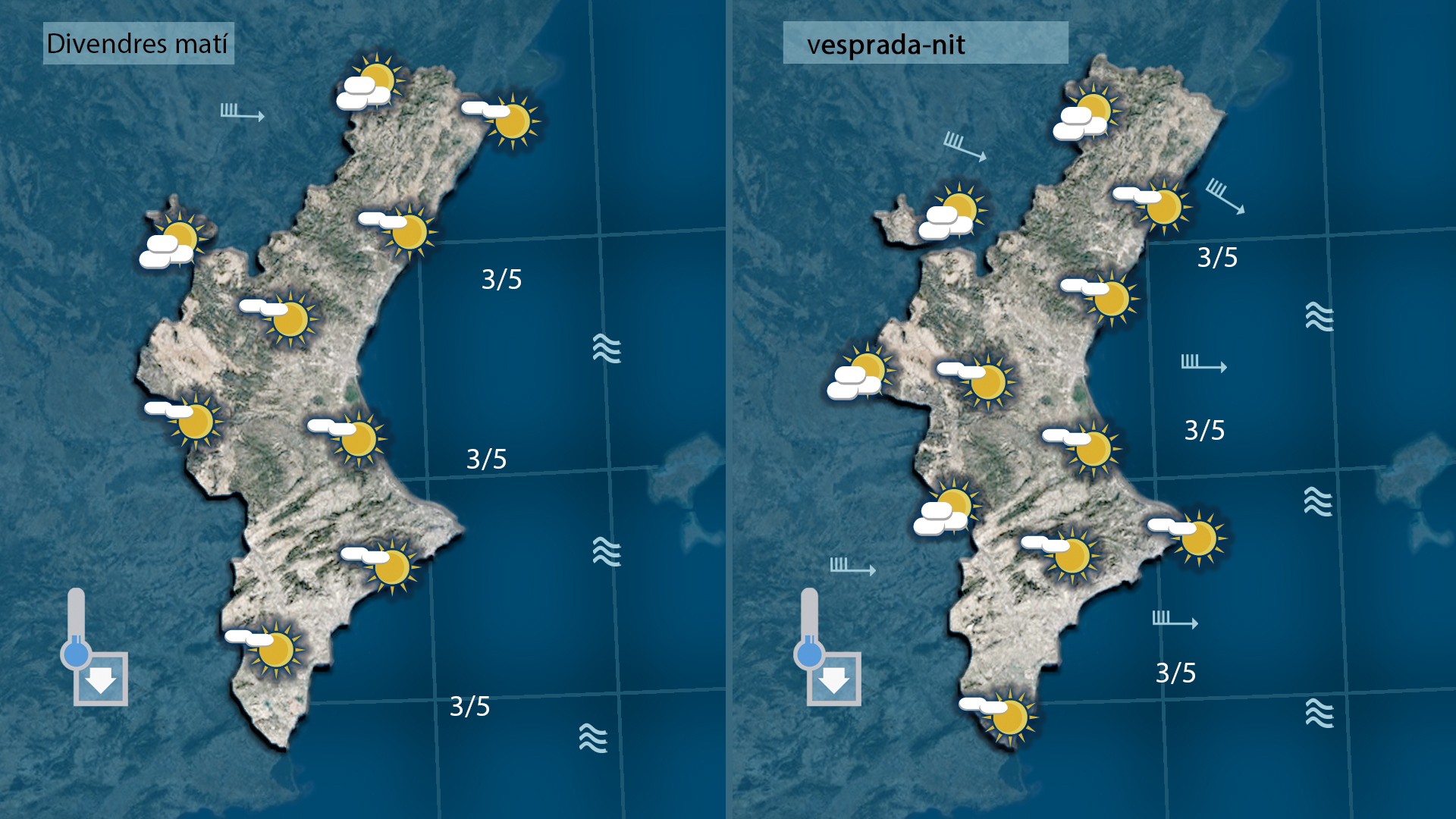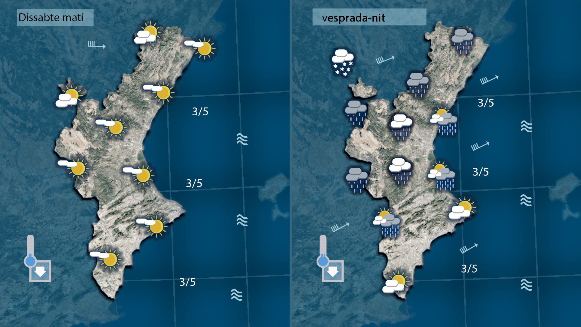 Donarem la benvinguda al cap de setmana amb temperatures més baixes, amb vents moderats de ponent i amb sol però no tardarem en tindre notícies de la pluja que durant la vesprada i de cara a la nit i matinada deiaran ruixats preou generals al nord i per l’interior amb una cota de neu entre els 1.000 i els 1.200 metres.