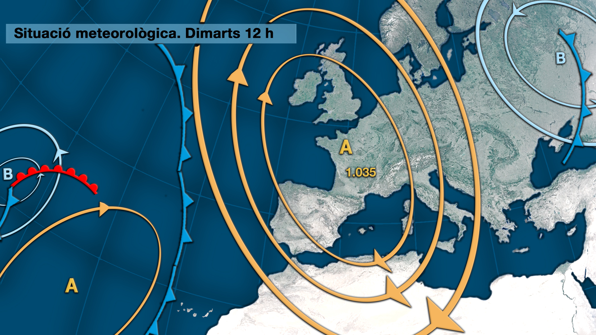 Hem de parlar d’un senyor anticicló que farà tot evolucione lentament i a més obligarà a la borrasca que demà comença a formar-se a l’Atlàntic a situar-se al nord de les Canàries on acabarà desfent-se.