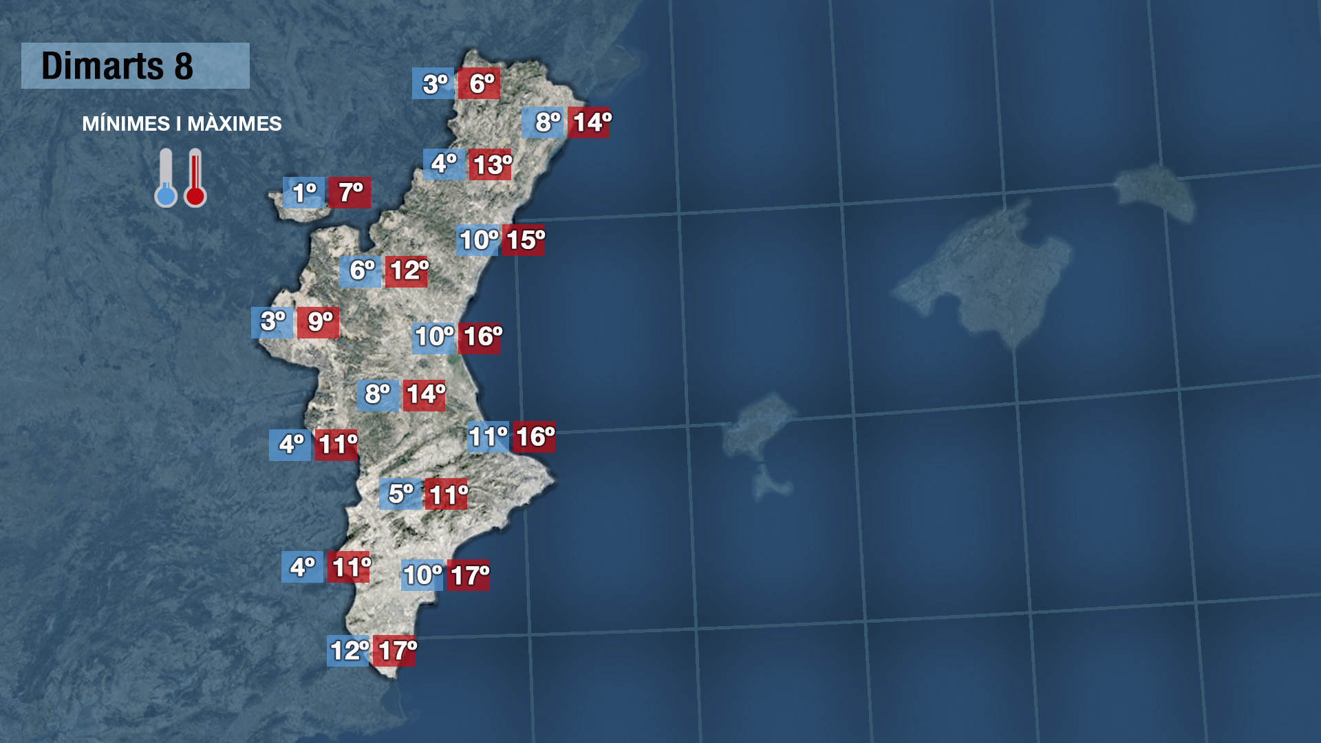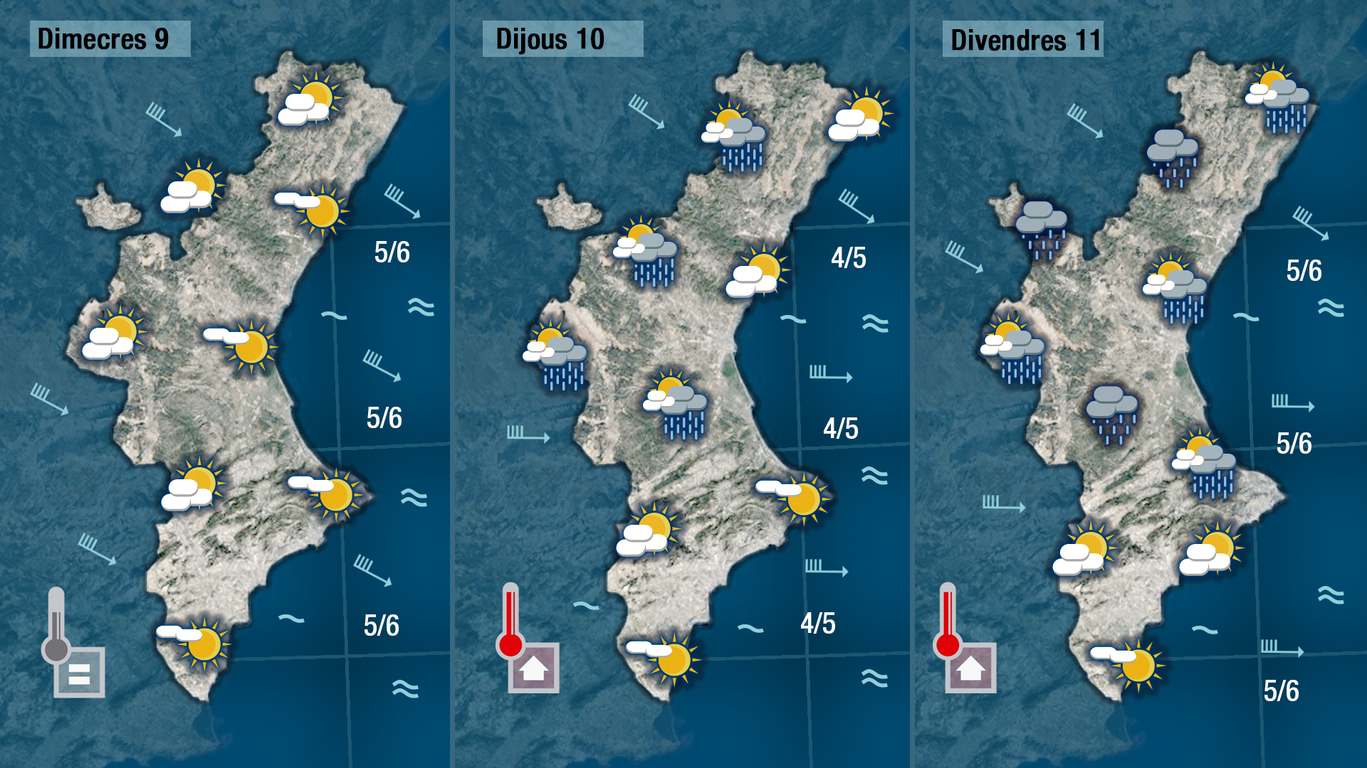 Dimecres es mantindrà l’ambient ventós i fresc i encara que dijousi divendres tindrem el cel més ennuvolat i la probabilitat de pluja serà major tampoc cal esperar pluges ni generals ni importants. Les temperatures pujaran i arribaran a tocar els 20 graus en punts de la costa.