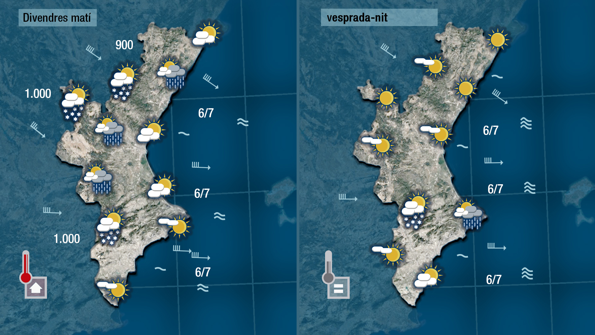 Demà divendres, a banda del vent i del fred, haurem de tindre en compte la possibilitat que es registren ruixats dèbils, que en punts de muntanya podran deixar la primera neu de la temporada per damunts dels 900-1.000 metres