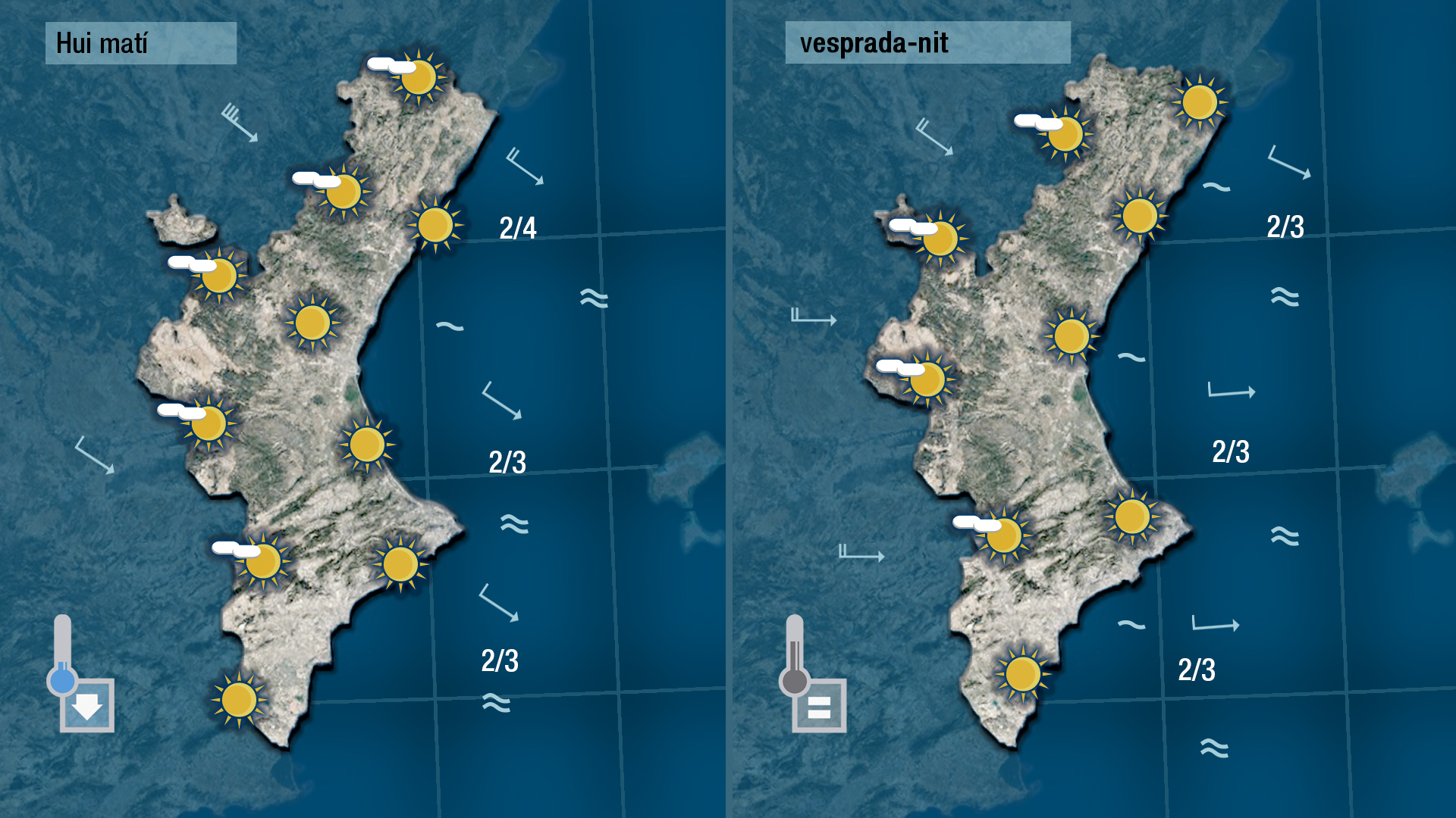 Al cel vorem pocs núvols. Al centre del dia les temperatures quedaran en valors pareguts als d’ahir i de nou a poqueta nit notarem com es reforça el vent.