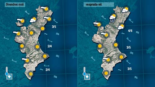 Hui tindrem el cel més ennuvolat i no pot descartar-se que puga ploure dèbilment. A migdia per l’interior i de vesprada a les comarques més centrals de València i d’Alacant. A poqueta nit i durant la matinada serà quan el vent torne a bufar amb més força.