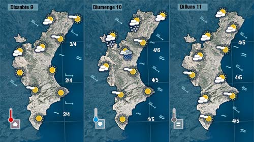 El vent perdrà força de nou dissabte i tornaran a pujar les temperatures lleugerament, però tampoc serà definitiu perquè diumenge ens espera un dia d’hivern amb un nou marcat descens de les temperatures que fins i tot podria portar la neu a les muntanyes del nord al voltant dels 1000 metres.