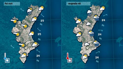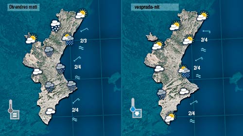 Demà divendres ( en altra situació seria motiu d’alegria però ara quasi ens té igual el dia que és) encara cal esperar un oratge molt variable, insegur i fresc. Encara persistirà la possibilitat que es registren ruixat a la costa del centre i del sud de la Comunitat que a les muntanyes, per damunt dels 1.000 metres serien de neu. De vesprada remitirien les pluges i s’obririen clars.